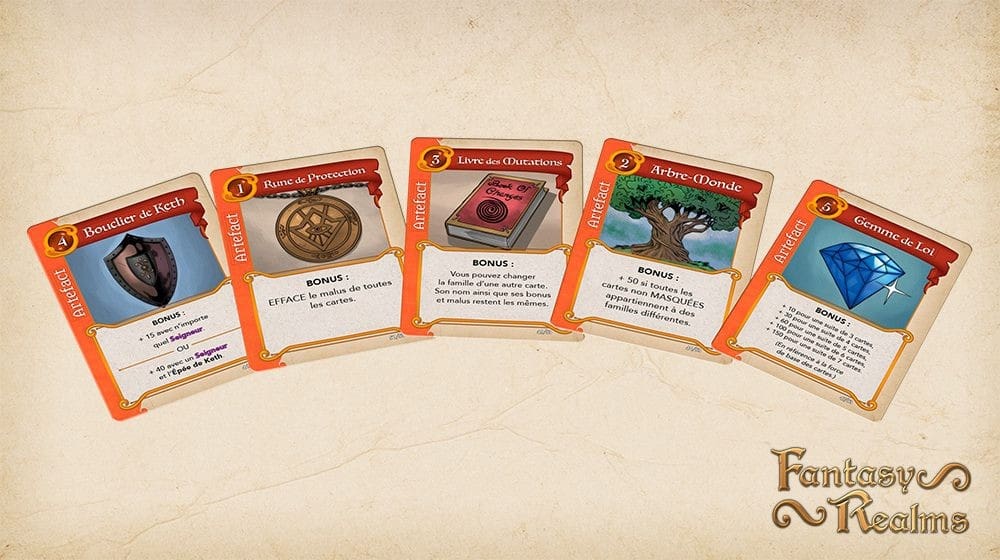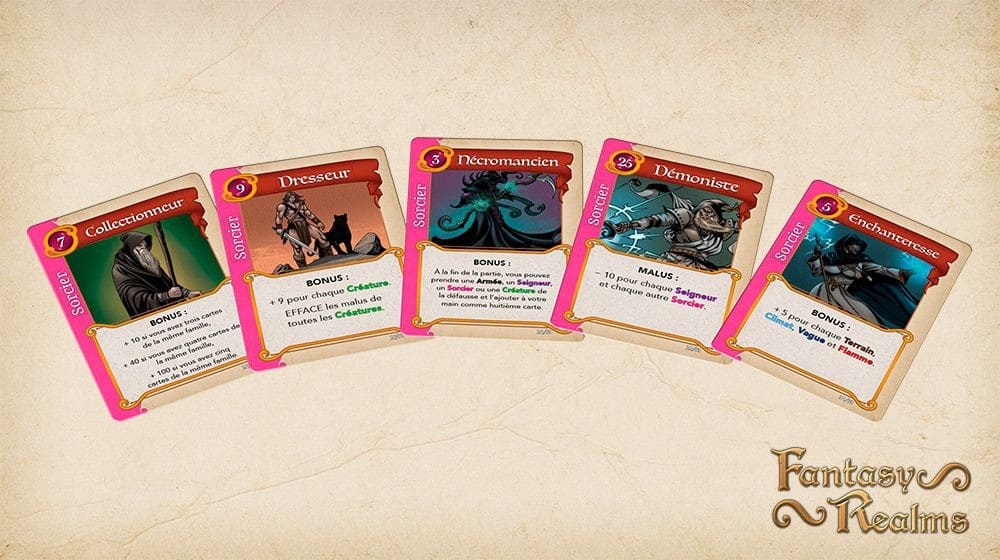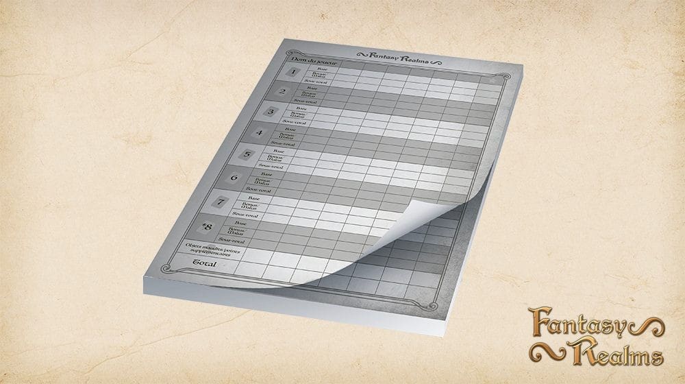 Dans Fantasy Realms, chaque partie est une aventure unique. Vous piochez des cartes du paquet ou de la défausse pour former les meilleures combinaisons possibles. La clé de la victoire réside dans votre capacité à choisir les cartes qui vous permettront d’obtenir le plus de points.