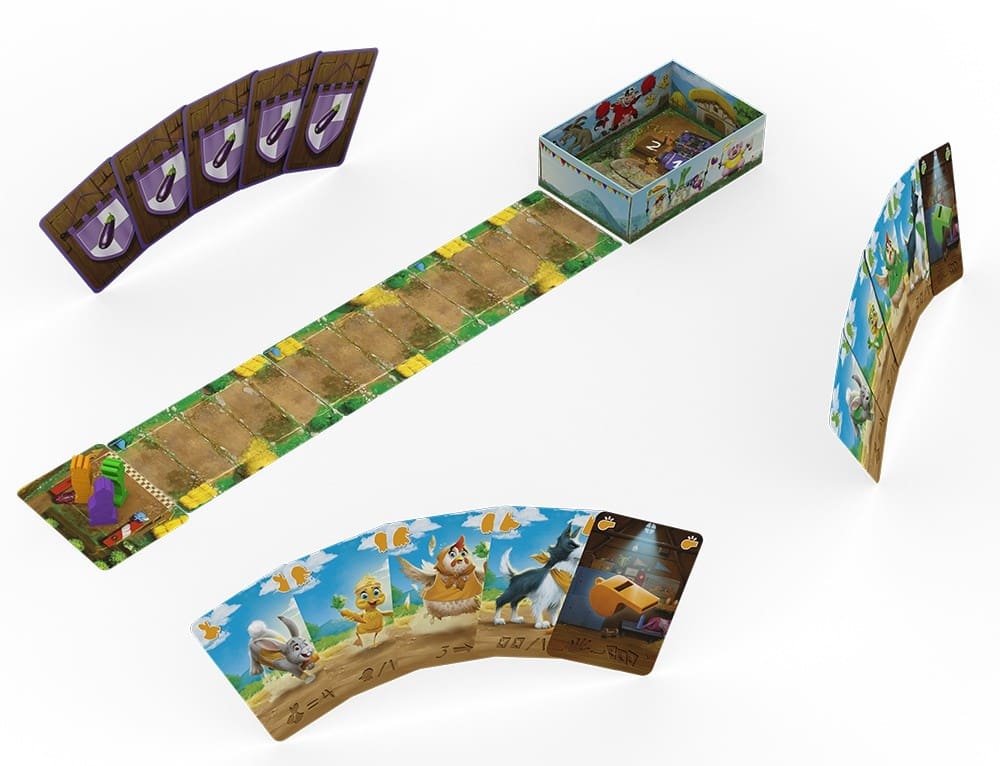 Chaque joueur va chercher à faire avancer son pion relais sur la piste de course à l’aide de sa main de cartes. Cette dernière est composée d’un Caneton, d’une Poule, d’un Lapin, d’un Chien, un Sifflet et un Coq. Chaque carte a des effets différents qui vont également dépendre des autres cartes jouées. Un peu de bluff, un peu de chance, un peu de chaos vous permettrons d’avancer votre relais jusqu’à la ligne d’arrivée. Faites aussi attention aux obstacles et aux pièges sur la piste !