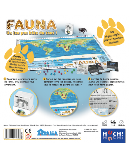 Un joueur tire une carte animal et lit les questions à haute voix. Les joueurs placent leurs pions sur le plateau pour indiquer leurs estimations (taille, poids, habitat, etc.). Révélez les réponses correctes et attribuez des points selon la précision des estimations. Scoring: