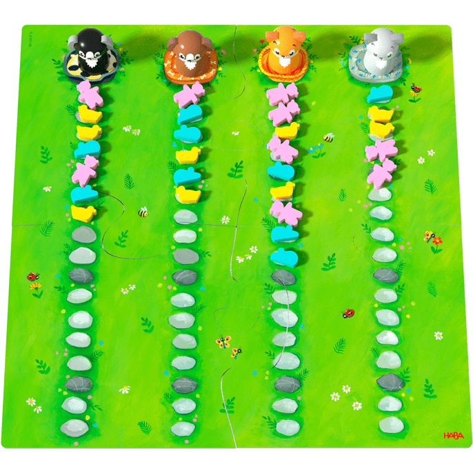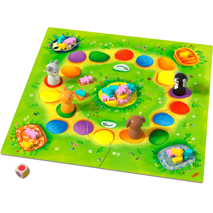 Le contenu du jeu comprend 4 grands animaux (1 chaton Tomy, 1 chaton Tigrou, 1 chiot Filou, 1 chiot Fripouille) et 27 petits jouets en bois (9 canards, 9 ours, 9 souris) adaptés aux petites mains des enfants. Le plateau de jeu est un puzzle de 4 pièces, et les tuiles « flèche » ajoutent un élément de surprise et de stratégie au jeu.