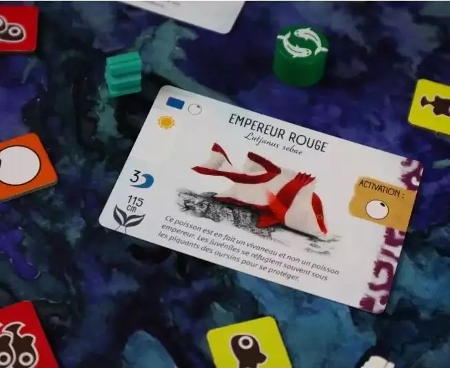 Cartes poissons, œufs, juvéniles, succès… Pions, ressources, et carnet de recherche