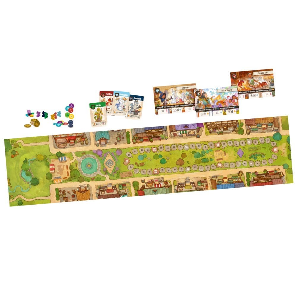 Votre objectif ultime est de devenir le Gardien des Flammes le plus renommé de la ville. Renforcez votre réputation en visitant des boutiques, plaçant des dragons artisans, lançant des enchantements et en accomplissant les objectifs secrets de vos dragons fantaisie. Chaque tour compte, et la compétition féroce entre les Gardiens des Flammes ne laisse place à aucune erreur.