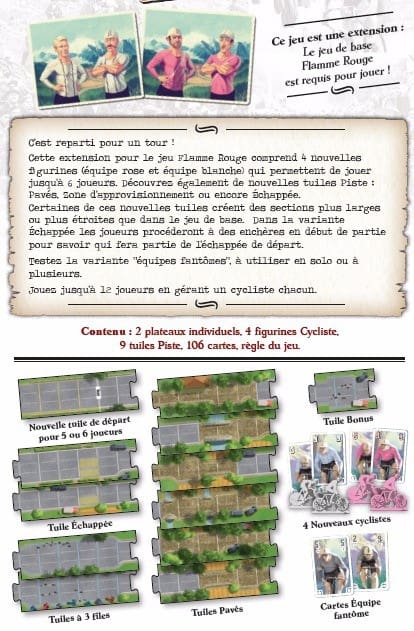 L’extension Peloton est livrée avec tout ce dont vous avez besoin pour étendre votre jeu Flamme Rouge : 2 plateaux individuels, 4 figurines cyclistes, 9 tuiles Piste, 106 cartes et bien sûr, la règle du jeu complète.
