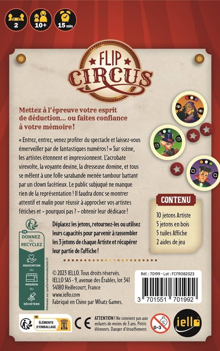 Bienvenue sous le chapiteau de Flip Circus, où le spectacle prend vie et la stratégie devient une performance ! Révélez votre talent de directeur artistique en planifiant astucieusement vos mouvements, en activant les artistes talentueux, et en orchestrant des performances spectaculaires. Un jeu de déduction, mémoire et ruse où vous devez être le premier à récupérer le plus de morceaux d’affiche pour devenir le maître du spectacle !