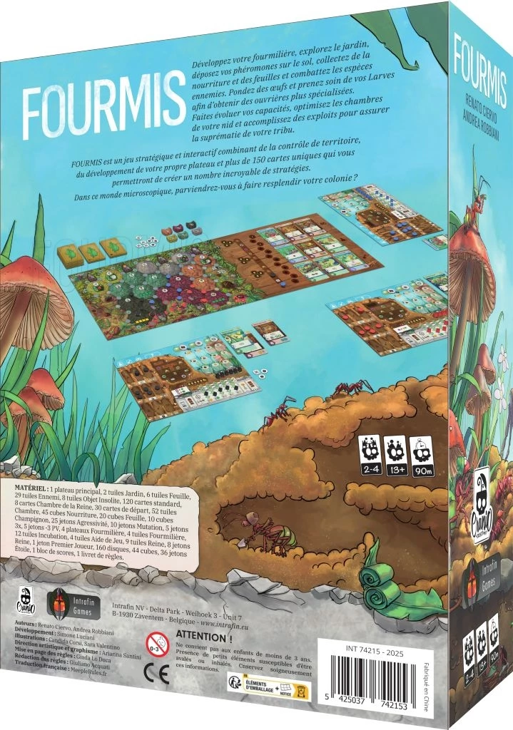Fourmis est un jeu de stratégie et de développement pour 2 à 4 joueurs. Dans ce jeu de société, vous contrôlez une colonie de fourmis, explorez le jardin, étendez votre fourmilière, collectez des ressources et affrontez les ennemis pour imposer votre suprématie sur vos rivaux.