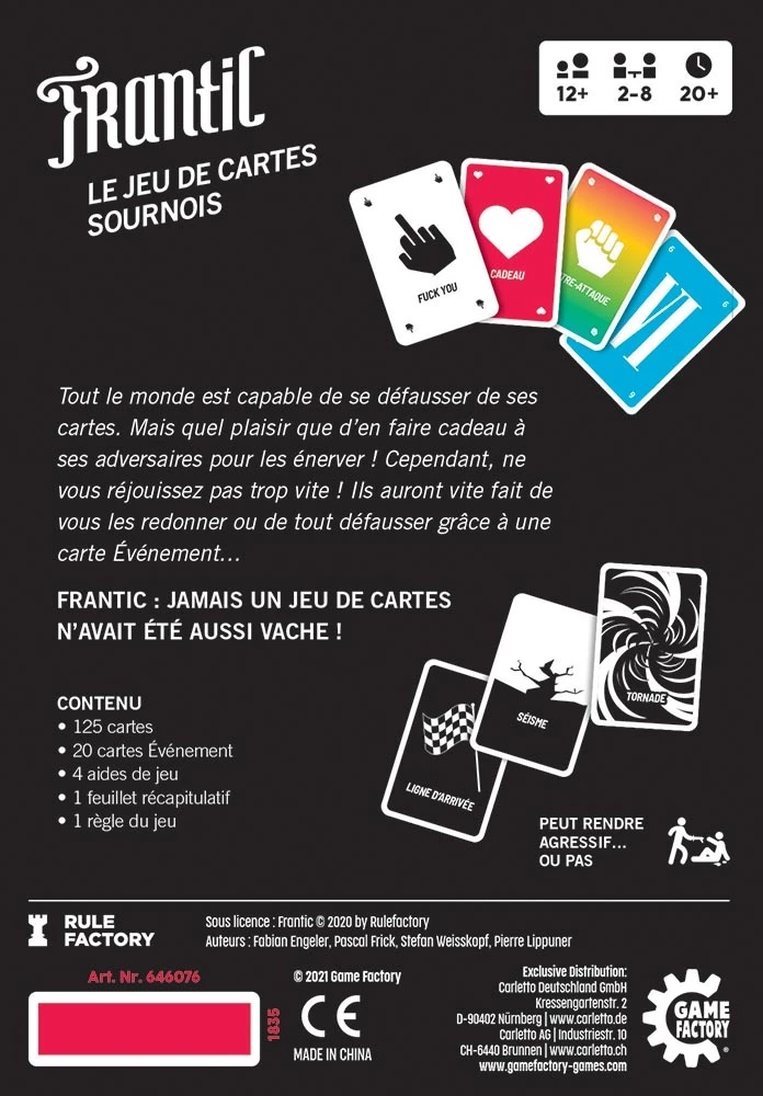 Frantic porte bien son nom : plus les mains s’amenuisent, plus la tension monte, et plus les coups bas fusent. On rit, on peste, on se venge… et on réclame immédiatement une nouvelle partie.