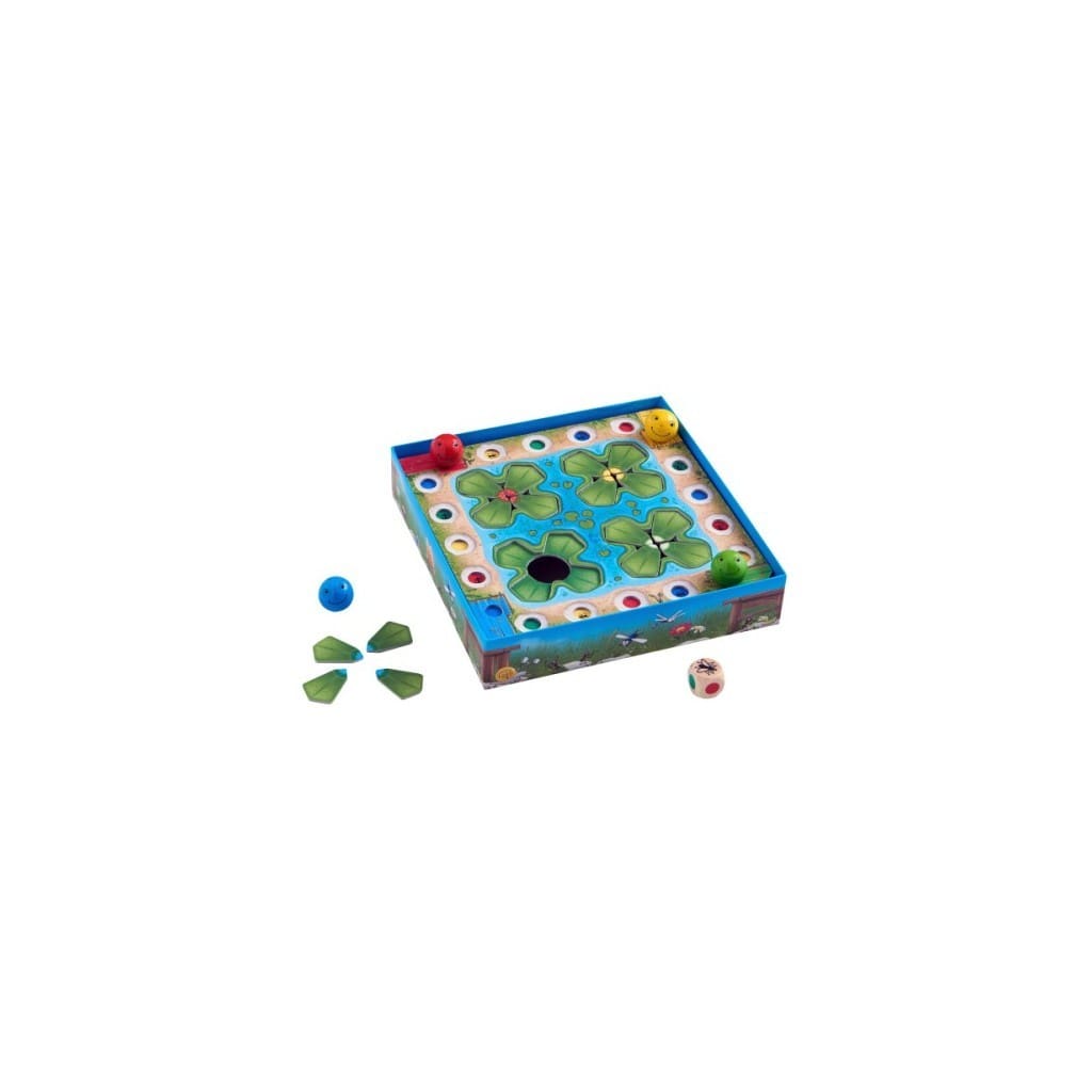 Contenu: 1 partie inférieure de la boîte avec 4 parois séparatrices, 1 plateau de jeu, 16 feuilles de nénuphar, 4 billes-grenouilles, 2 dés, 1 règle du jeu.