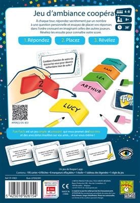 Ce jeu d’ambiance simple et amusant vous promet des fous rires et des anecdotes insolites sur vos proches… et sur vous-même ! C’est également le jeu idéal pour apprendre à se connaitre dans une atmosphère bienveillante, en famille comme entre amis. Avec Fun Facts, vous n’êtes jamais à l’abri d’une surprise.