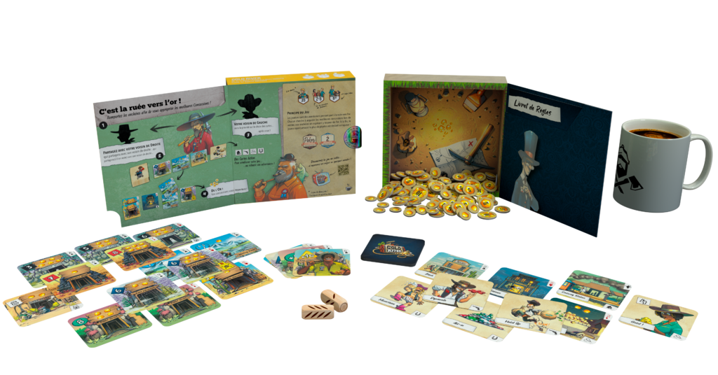 Vous incarnez des aventuriers prenant part à la ruée vers l’or. Faites l’acquisition des meilleurs filons lors de ventes aux enchères puis, avec de la chance aux dés, vous y trouverez de l’or !
