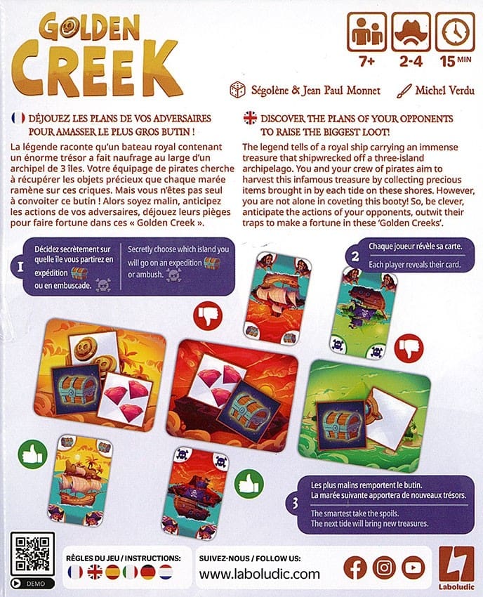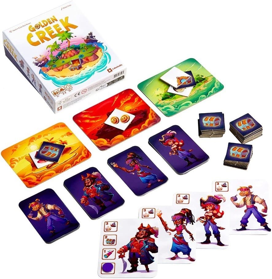 « Golden Creek » est un jeu rapide et stratégique où la ruse et l’anticipation sont clés pour remporter la victoire. À chaque tour, prenez des décisions cruciales : récupérerez-vous un trésor ou pillerez-vous vos rivaux? Seuls les pirates les plus malins réussiront à naviguer ces eaux dangereuses et à faire fortune! Préparez-vous pour une aventure riche en rebondissements et en butins!