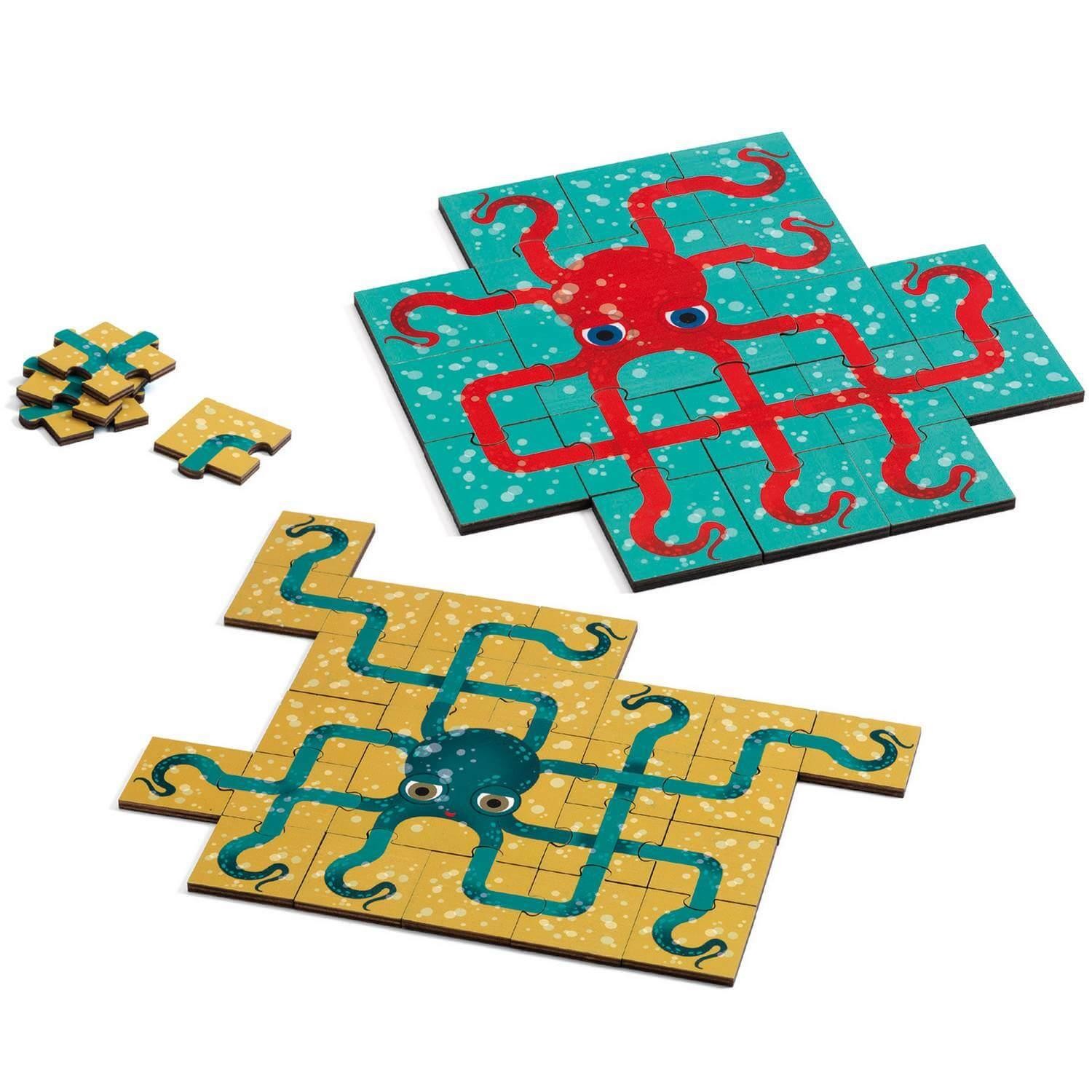 Découvrez le jeu Guzzle de Djeco, un jeu de tactique pour 2 joueurs, un jeu de société pour jouer dès 6 ans. Qui sera le plus rapide à construire son poulpe? Une course effrénée pour réaliser un poulpe parfait. Un système d’assemblage très simple pour une réalisation pas si facile qu’il n’y parait! Chaque poulpe devra bien évidement avoir 1 tête, 8 tentacules et toutes devront être correctement reliées à sa tête grâce aux pièces du puzzle. Une multitude de possibilités, mais un seul gagnant! Attention à ne pas vous emmêler les tentacules dans la précipitation! Envie de corser le jeu? Choisissez avant de commencer un plus grand nombre de pièces imposées à intégrer dans vos poulpes. Le plus rapide gagne la manche!
