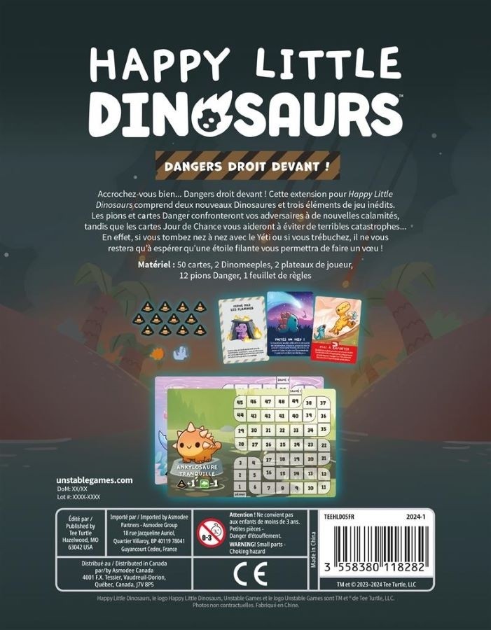 L’extension Accrochez-vous bien … Dangers droit devant ! est parfaite pour ceux qui cherchent à ajouter encore plus de fun et de stratégie à Happy Little Dinosaurs. Avec ses nouveaux personnages et mécaniques de jeu, chaque partie devient un véritable défi pour éviter les nombreux dangers qui se profilent à l’horizon. Préparez-vous à affronter de nouvelles catastrophes avec humour et adresse !