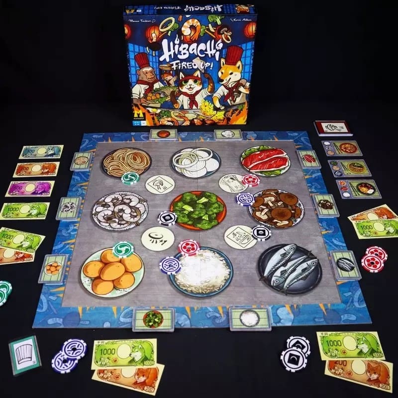 Dans Hibachi, chaque joueur prend le rôle d’un chef de cuisine qui doit impressionner ses clients par ses talents culinaires et son sens du spectacle. Le but du jeu est simple mais captivant : collectez les bons ingrédients pour réaliser les commandes de vos clients en lançant des jetons sur une surface de cuisson.