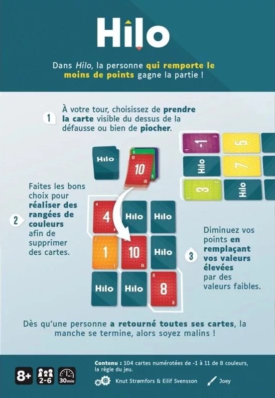 HILO se joue en plusieurs manches, et la tension ne fait qu’augmenter à mesure que les points s’accumulent. Le jeu se termine dès qu’un joueur atteint au moins 100 points, alors chaque décision compte. Ne perdez pas de temps et soyez rapide pour retourner toutes vos cartes avant vos adversaires !