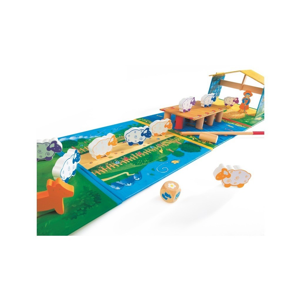 La boite de jeu contient un plateau constitué de 4 planches, 1 bergerie à assembler et 1 pont, 10 piliers de pont, 1 baguette, 11 pions (1 bergère, 9 moutons et 1 chien), 1 dé en bois et la règle du jeu en 10 langues.