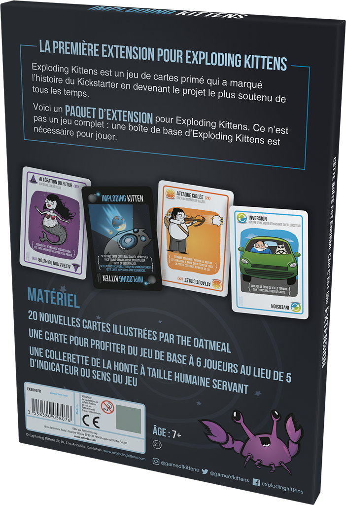 Imploding Kittens c’est toujours de l’humour, des chats explosifs et des parties rapides, funs et déjantées. C’est surtout 20 nouvelles cartes, une carte pour profiter du jeu de base à 6 joueurs au lieu de 5 et une collerette de la honte à taille humaine servant d’indicateur du sens du jeu ! Désamorcez-moi tout ça !