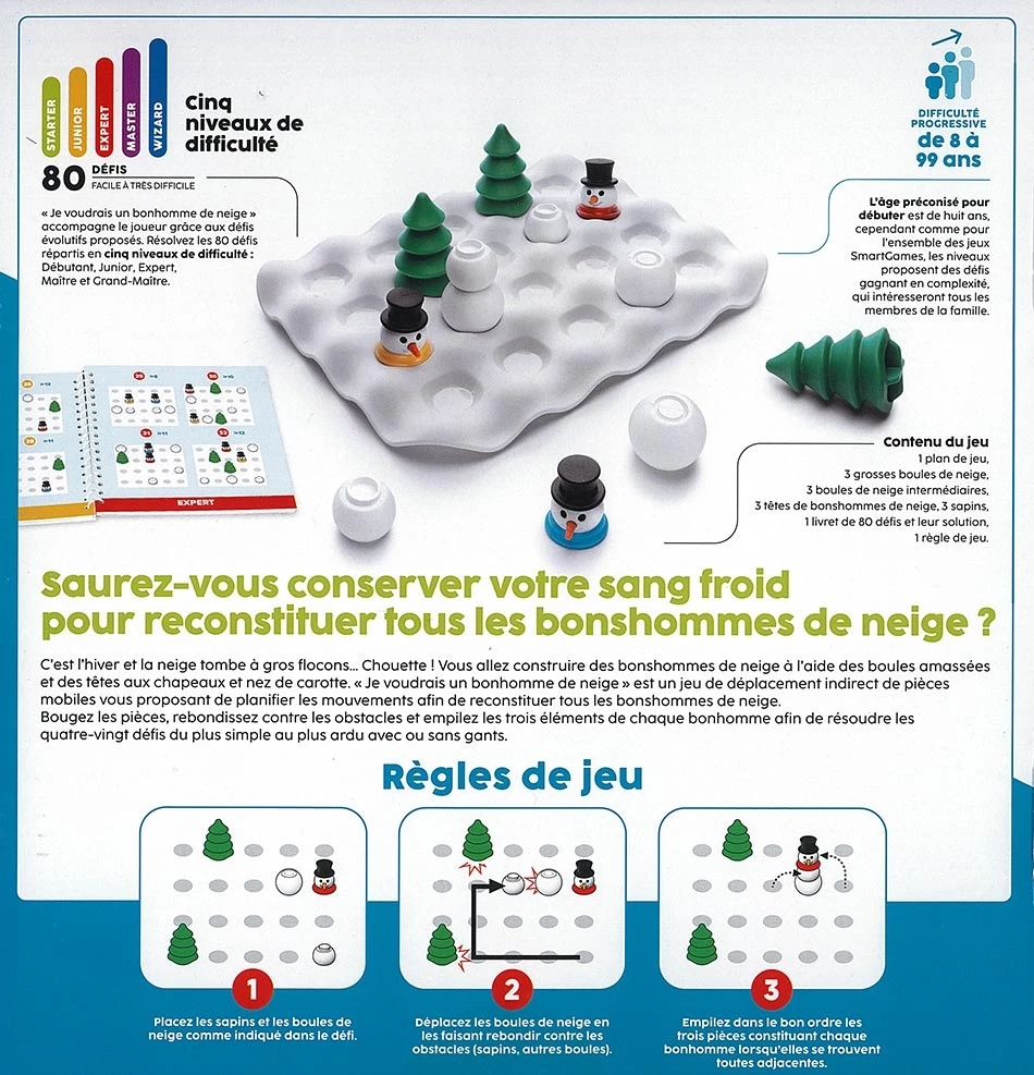 Pensé pour le jeu en solo, Je voudrais un bonhomme de neige est idéal pour les amateurs de puzzles, de défis logiques et de jeux Smart Games. Compact, facile à sortir et immédiat à comprendre, il offre de longues heures de réflexion dans un univers doux et hivernal.