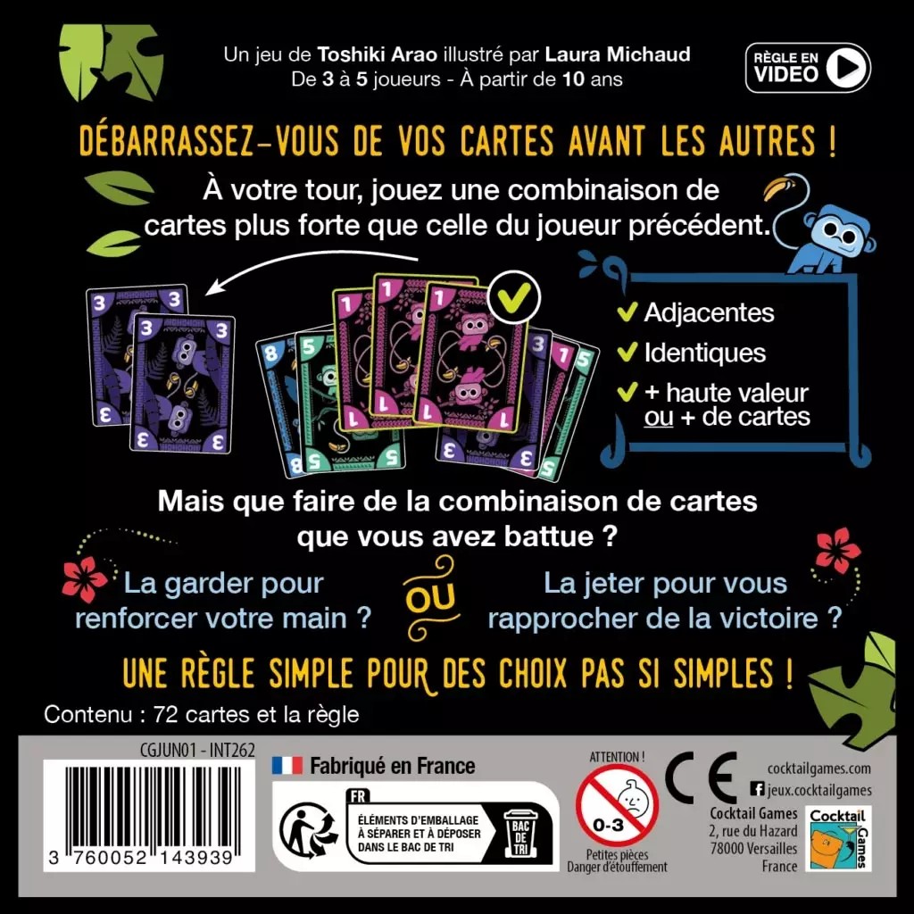 Dans Jungo, le but est simple : vous débarrasser de toutes vos cartes avant vos adversaires ! Mais attention… vous ne pouvez pas réorganiser votre main, ce qui ajoute un vrai défi de réflexion et de gestion.