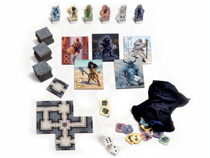 80 plaquettes de catacombes, 6 pions de héros avec 6 supports, 6 cartes de héros, 5 plateaux d’inventaire, 30 jetons de vies, 1 sachet opaque pour les monstres et les trésors, 43 jetons de monstres, 10 jetons de coffres, 2 dés, 1 jeton rond de damnation, 1 règle du jeu, 1 artbook.