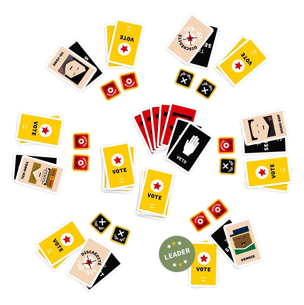 Kill Kim vous plonge au cœur d’une conspiration politiquement chargée où les alliances sont éphémères et la ruse est la clé de la victoire. Avec des cartes et du bluff, chaque joueur se trouve dans l’un des trois camps: les complotistes, les fanatiques ou la CIA, chacun avec un objectif distinct.