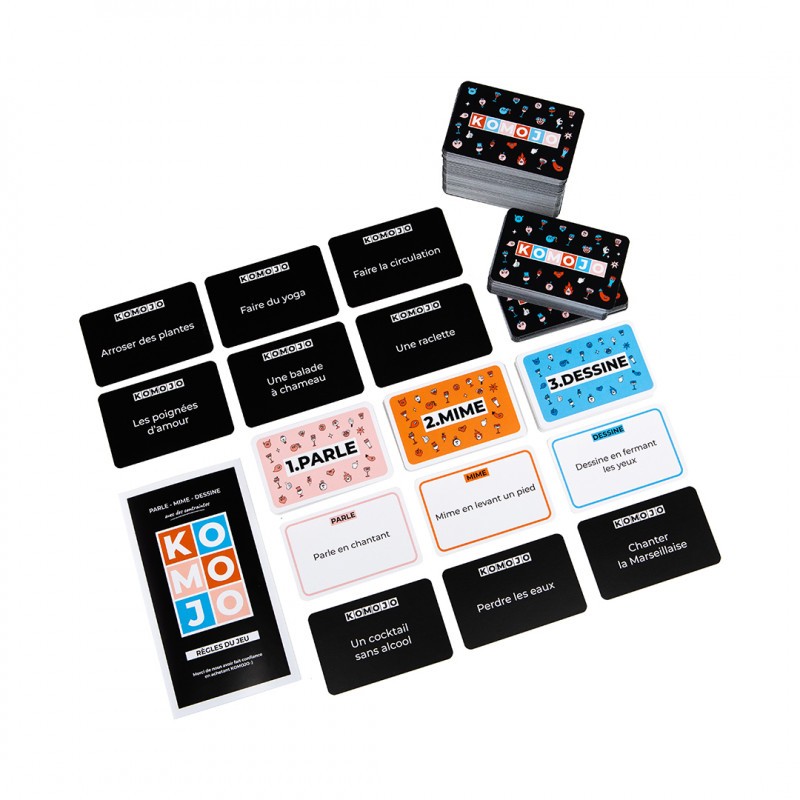 Faites deviner un maximum de cartes Komojo en 45 secondes à votre équipe en faisant deviner les mots ou phrases de vos cartes. Selon la phase vous devrez parler, mimer ou dessiner, pour corser le tout et apporter un peu de folie, vous devrez le faire sous des contraintes plus farfelues les unes que les autres !