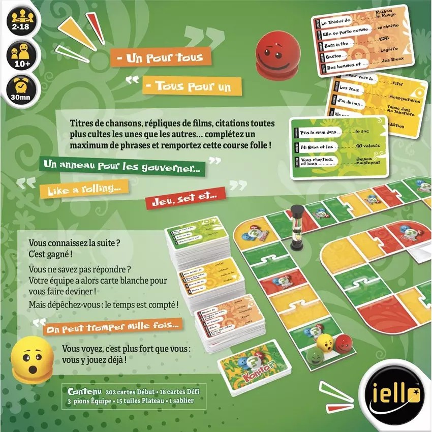 Formez deux ou trois équipes et affrontez-vous dans une course effrénée jusqu’au bout du plateau. À chaque tour, un joueur lit le début d’une phrase à son équipe, qui doit en trouver la fin. Il peut faire deviner la réponse par tous les moyens possibles : mimes, indices, synonymes… mais sans jamais dire la réponse directement !