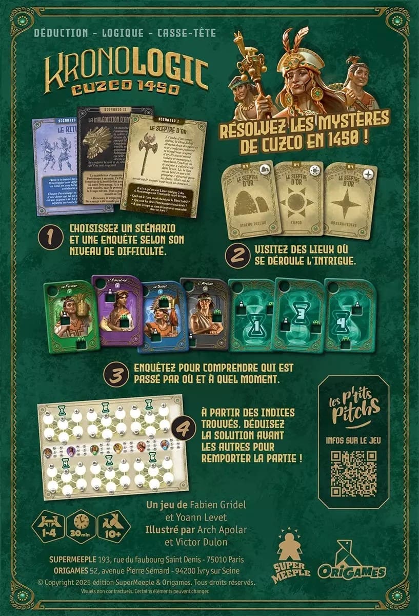Kronologic : Cuzco 1450 est un jeu de logique et de déduction pour 1 à 4 joueurs. Après Kronologic : Paris 1920, cette nouvelle enquête vous transporte au Pérou, au cœur des Andes, à l’époque des Incas. Mystères, déplacements suspects, énigmes spatio-temporelles… Parviendrez-vous à rétablir la vérité ?