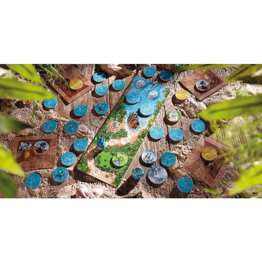 Contenu: 1 plateau de jeu, 1 figurine « capitaine Barbe Blanche », 30 tuiles de mer, 1 pièce « destin », 4 plaques de coffre à trésors, 1 dé.