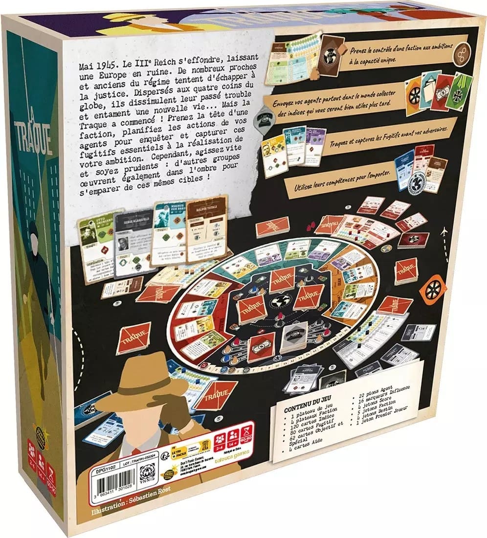 Dans La Traque, chaque joueur incarne le chef d’une faction secrète aux objectifs particuliers. Votre mission : identifier, traquer et capturer des fugitifs en fuite avant vos rivaux… tout en les empêchant d’atteindre leurs propres objectifs.
