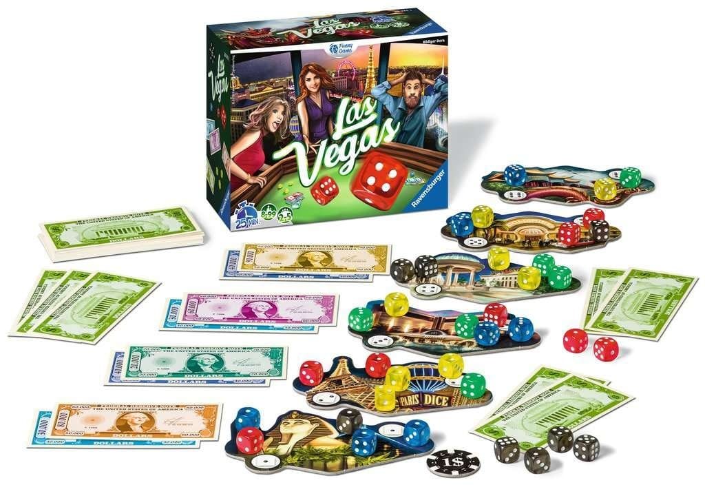 Las Vegas est un jeu de dés palpitant où les joueurs se lancent dans une compétition effrénée pour accumuler le plus d’argent en visitant les célèbres casinos de Las Vegas.