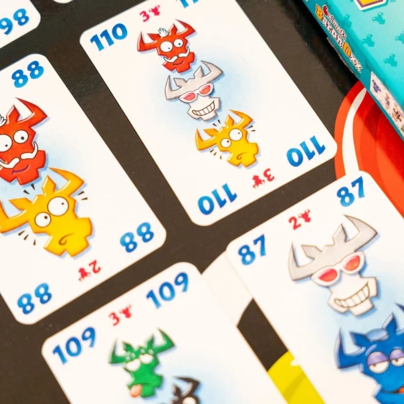 Posez vos cartes dans une des 5 rangées en respectant les couleurs des têtes de bœuf disponibles. Mais attention : si vous posez la 6e carte ou la 6e tête de bœuf de la même couleur d’une rangée, vous devez ramasser les cartes ! Vous récupérez ainsi des points négatifs. Alors arrangez-vous plutôt pour forcer vos adversaires à les ramasser et ainsi peut-être remporter la victoire !