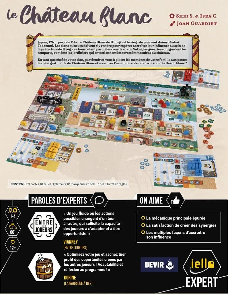 Voyagez dans le Japon de 1761, à l’époque de l’ère Edo, et plongez-vous dans l’intrigue politique et sociale du Château Blanc de Himeji. Dans ce jeu captivant, vous et vos adversaires dirigez des clans concurrents, cherchant à accroître votre influence à la cour du puissant daimyo Sakai Tadazumi.