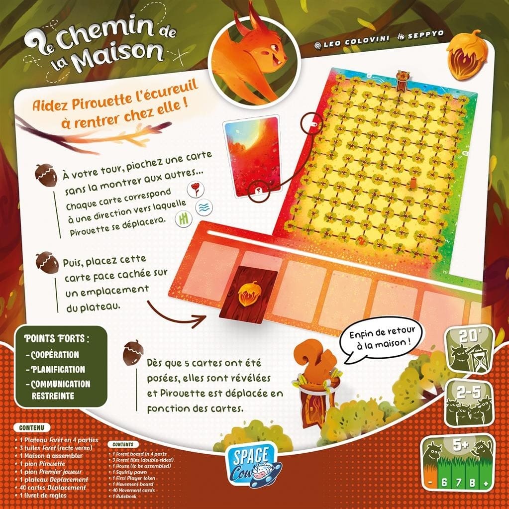 Le Chemin De La Maison est un jeu coopératif où les joueurs doivent guider Pirouette, l’écureuil, à travers un labyrinthe forestier jusqu’à sa maison avant que la pioche de cartes ne soit épuisée. Voici comment jouer :