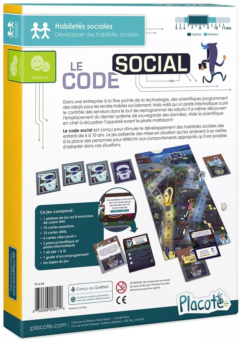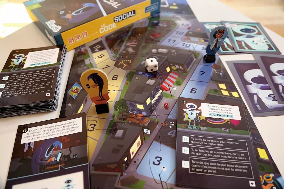 Le Code Social – Coopérez, apprenez… et déjouez le pirate ! Le Code Social est un jeu de parcours coopératif pensé pour aider les enfants de 6 à 10 ans à mieux comprendre et appliquer les règles de la vie en société. Ensemble, les joueurs doivent traverser différentes situations sociales et relever des défis pour atteindre un entrepôt secret… avant qu’un pirate informatique ne les devance !