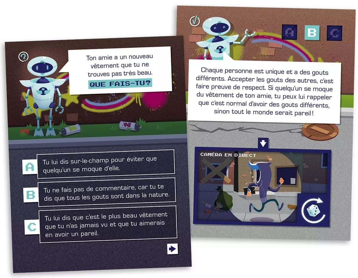 Un jeu éducatif et amusant Grâce à 72 mises en situation concrètes, les enfants se projettent dans des contextes de la vie quotidienne à l’école, à la maison, ou entre amis. En discutant et en choisissant ensemble la meilleure réaction, ils développent des compétences sociales essentielles tout en s’amusant.