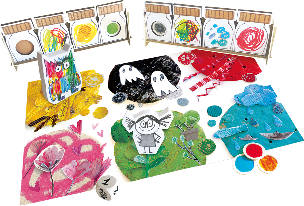 Contenu • 1 plateau de jeu • 1 jeton monstre des couleurs • 1 jeton petite fille • 1 dé • 8 jarres pour y stocker les émotions • 2 étagères pour y ranger les jarres • 5 marqueurs d’émotion.