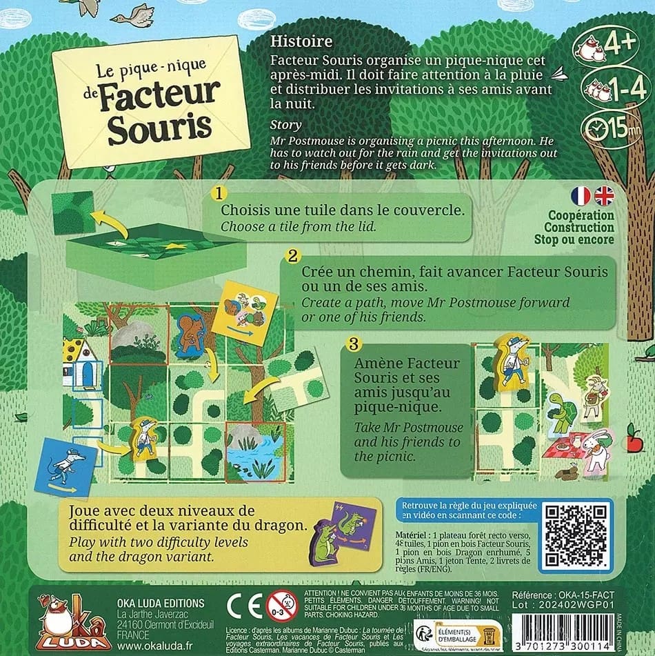 Comment jouer à facteur souris Dans ce jeu coopératif accessible dès 4 ans, votre mission est d’aider Facteur Souris à tracer un chemin sûr tout en distribuant un maximum d’invitations aux habitants de la forêt. Mais attention : la pluie et la nuit pourraient contrecarrer vos plans !