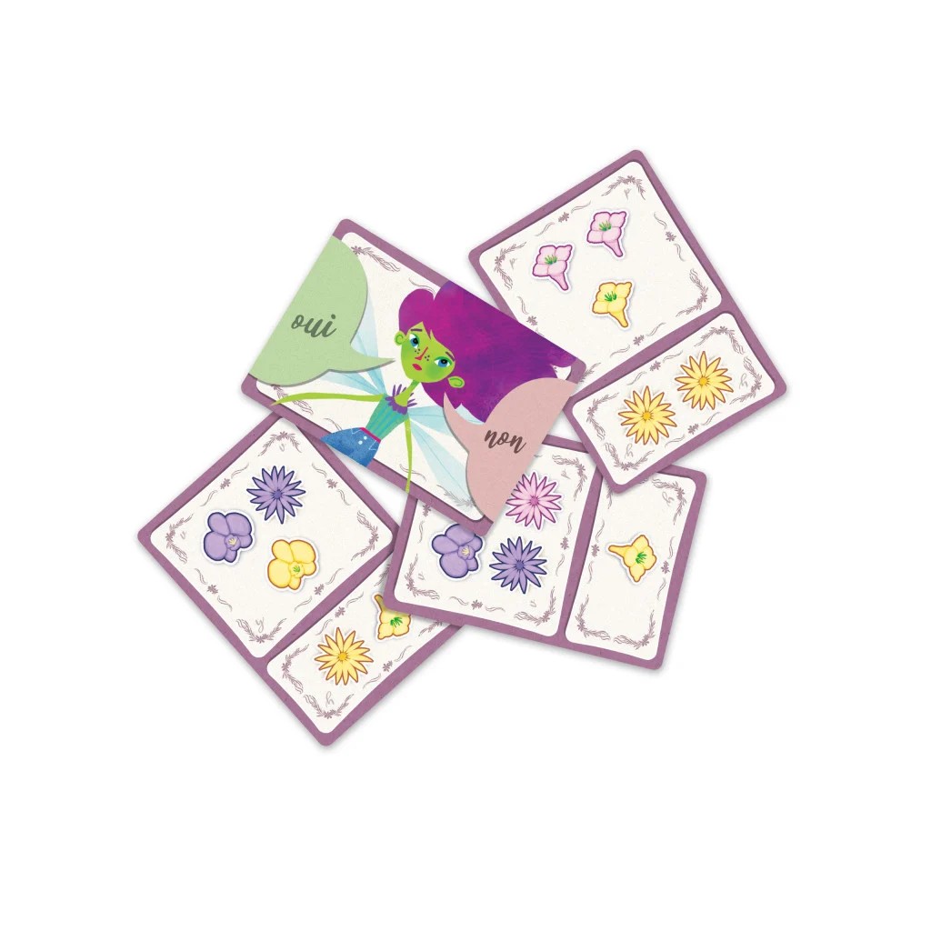 Ils commencent par tirer deux cartes fleurs, chacune ayant deux groupes de fleurs de chaque côté, puis placent un groupe sur une carte du côté oui de la carte Fée et un groupe sur l’autre carte du côté non.