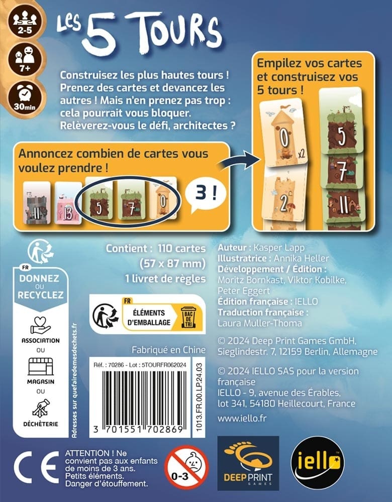 Bienvenue dans Les 5 Tours, un jeu où vous incarnez un architecte audacieux prêt à rivaliser avec d’autres pour ériger les plus hautes tours. Pour gagner, il vous faudra faire preuve de stratégie, de prudence, et parfois, d’audace.
