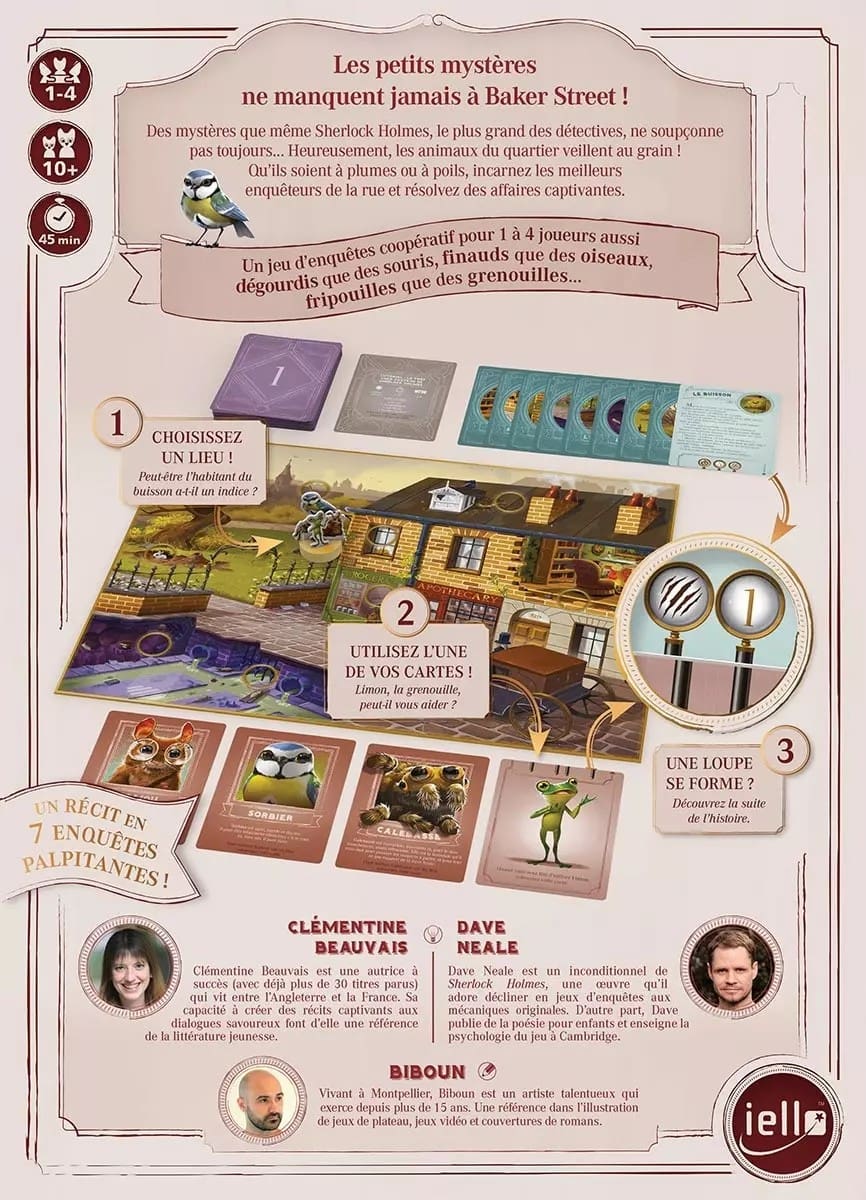 Les Animaux de Baker Street est un jeu d’enquête coopératif pour 1 à 4 joueurs, plongé dans un Londres du XIXe siècle réinventé, à la fois charmant et mystérieux. Vous incarnez un groupe d’animaux attachants – à plumes, à poils ou à écailles – bien décidés à faire régner la justice dans leur quartier.