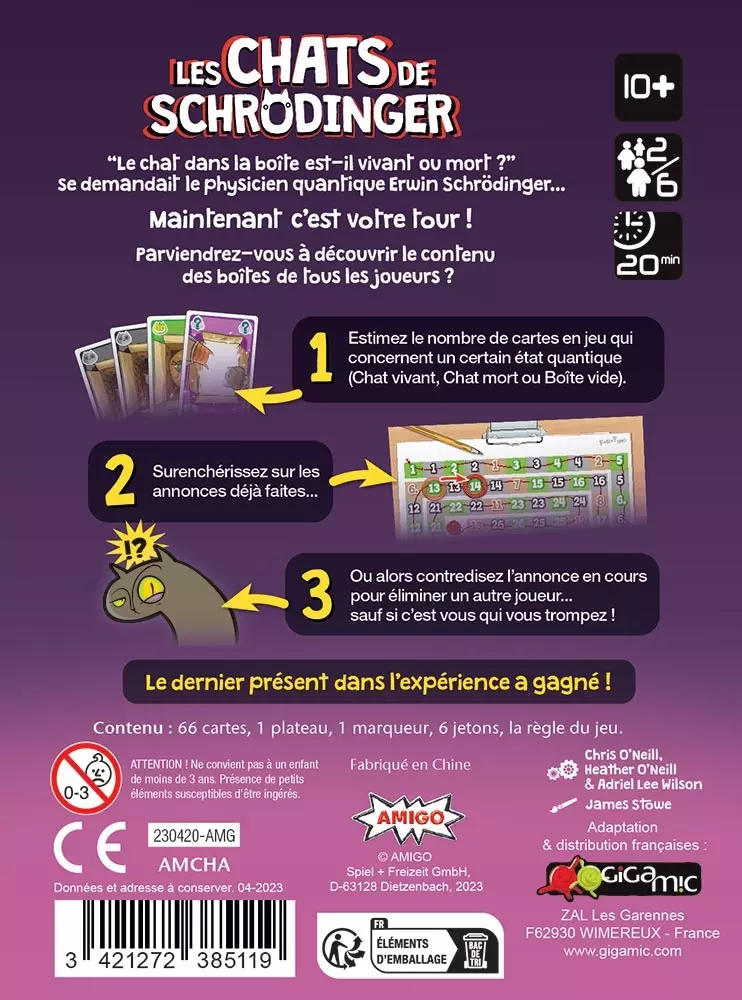 Faites des annonces sur l’état des cartes en jeu (Chat vivant, Chat mort, Boîte vide). Surenchérissez ou contredisez pour éliminer d’autres joueurs, mais attention, si vous vous trompez, vous êtes éliminé !