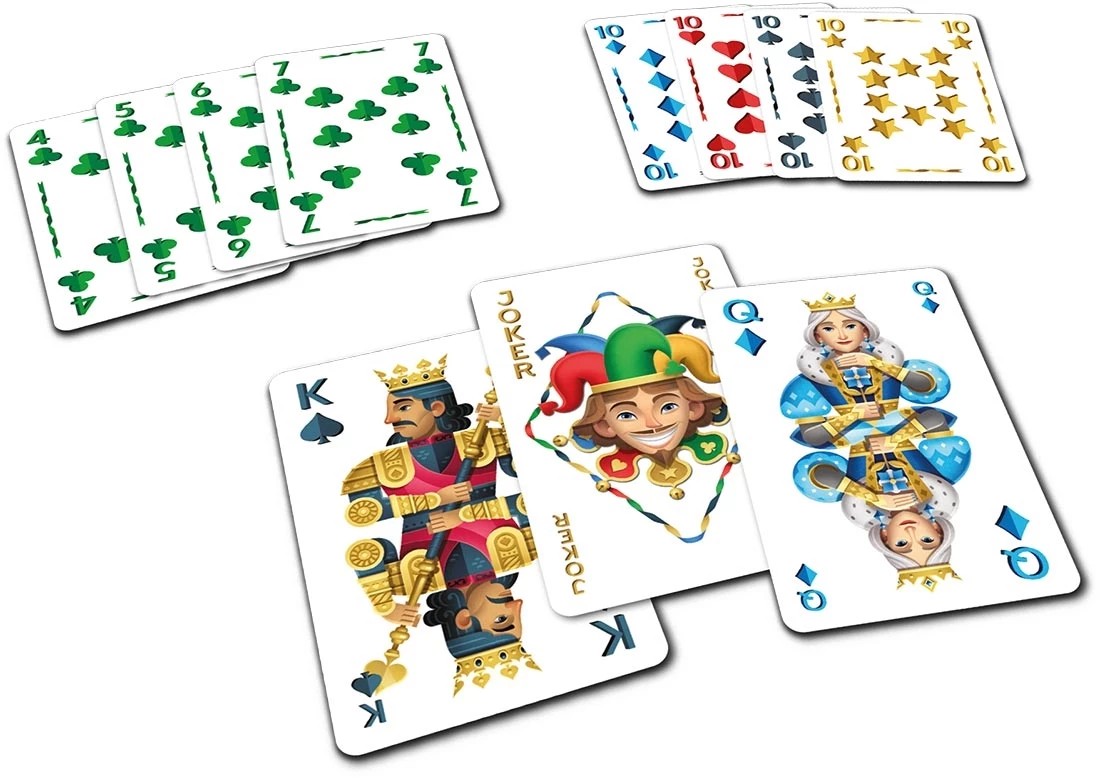 Les Cinq Rois est un jeu de cartes inspiré du Rami avec 5 couleurs et une bonne dose de malice en plus ! Les 5 couleurs : pique, coeur, carreau, trèfle et étoile permettent de faciliter l’arrangement de votre main en suite ou en famille. Au fur et à mesure des manches, les joueurs joueront avec une carte de plus et l’atout changera en fonction : si le tour est joué avec 5 cartes, l’atout pour cette manche sera le 5… Faites les bonnes combinaisons pour vous débarrasser en premier de vos cartes et pour marquer manche après manche le moins de points possible. Un jeu universel et simple pour lequel on enchaîne les parties avec plaisir !