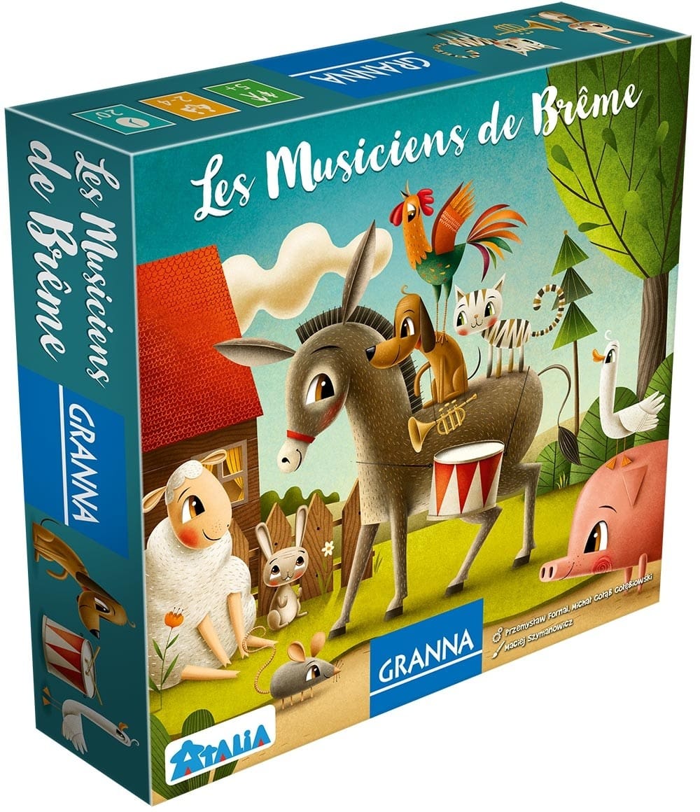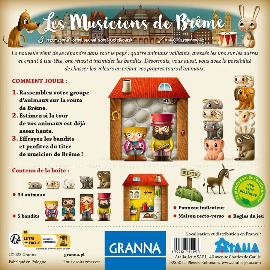 Une fois que toutes les tours sont construites, celle qui est la plus basse remporte la partie. Les joueurs doivent donc trouver le bon équilibre entre la hauteur de leur tour et l’effet de peur qu’elle inspire aux bandits. Avec son mélange unique de stratégie, de collaboration et de compétition, Les Musiciens de Brême promet des heures de plaisir pour toute la famille.