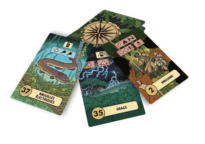 Chaque demi-journée d’expédition, les joueurs posent 6 cartes Aventure qui représentent leur progression. Le matin, ces cartes sont résolues en ordre croissant, tandis que l’après-midi, elles sont résolues dans l’ordre où elles ont été posées. Ces cartes Aventure déterminent votre destin, vous permettant d’avancer sur les cartes Chemin, de récupérer des objets et des compétences essentiels, tout en évitant des pièges sournois et des obstacles mortels. La jungle est impitoyable, et chaque choix peut faire la différence entre le succès et l’échec.