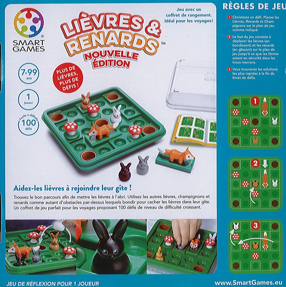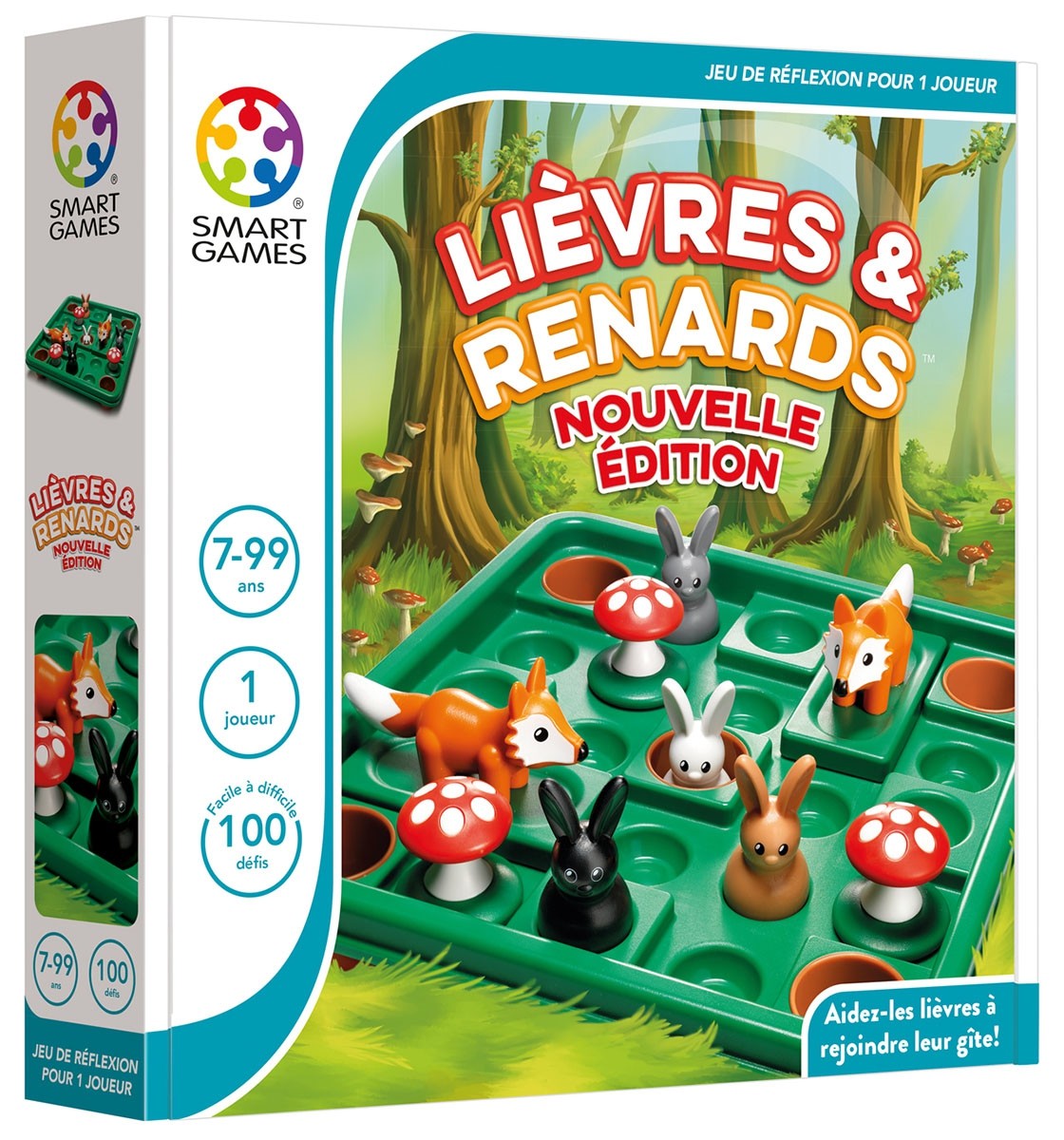 Trouvez le bon parcours afin de mettre les lièvres à l’abri. Utilisez les autres lièvres, champignons et renards comme autant d’obstacles par-dessus lesquels vous pourrez bondir pour cacher les lièvres dans leur gîte. Choisissez un défi parmi les 60 proposés et posez les lièvres, champignons et renards comme demandé. Faites alors bondir vos lièvres ! Sans oublier de mettre quelques obstacles sur leur parcours, obligatoires pour permettre leur déplacement. Certains obstacles sont fixes, d’autres sont mobiles… A vous de trouver les meilleures opportunités de mouvements pour les aider à rejoindre leur abri au plus vite ! Cette nouvelle édition du jeu de logique Lièvres et Renards propose un lièvre supplémentaire et 40 nouveaux défis en plus des 60 d’origine pour des heures de jeu !