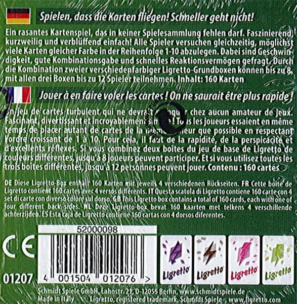 Ligretto Vert offre une variété de cartes avec 4 versos différents (violet, marron, rose foncé, vert), ajoutant une touche de variété et de style à vos parties.