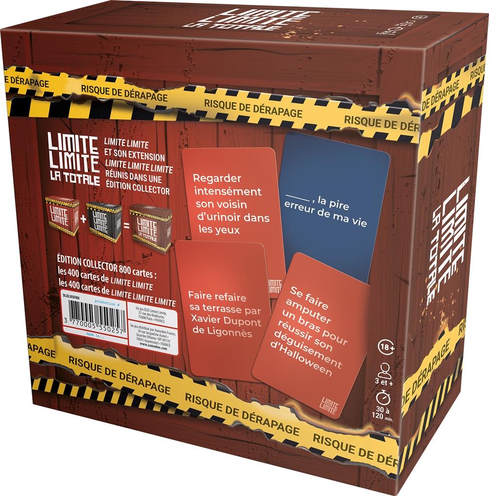 Un délire convivial et hilarant avec 800 cartes dans Limite Limite la Totale, contenant toutes les cartes des deux boîtes adultes. Au total ce sont des millions de combinaisons possibles pour des surprises et des fous rires à chaque partie.