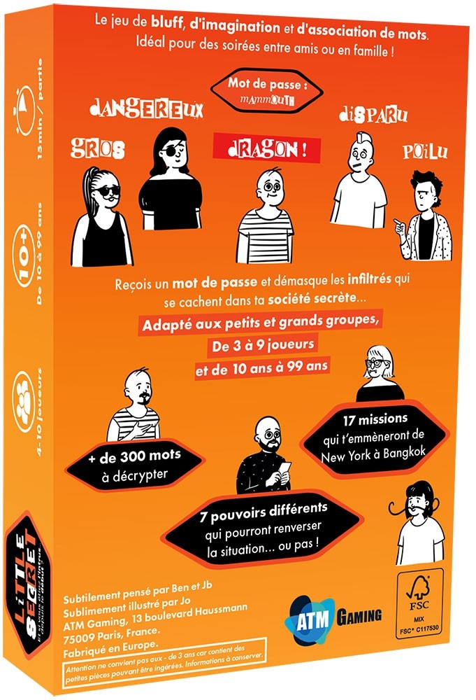 Le but de Little Secret est d’éliminer les joueurs qui possèdent un mot de passe différent du sien. C’est un jeu intuitif de bluff, d’imagination et d’association de mots. Idéal pour des soirées entre amis ou en famille !