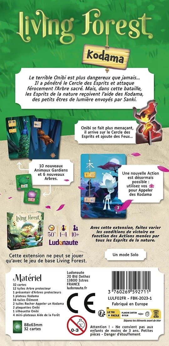 Contexte et Thème : Dans l’univers de « Living Forest », les animaux et esprits de la nature s’unissent pour repousser Onibi, l’ennemi redoutable qui attaque l’Arbre sacré. L’extension Kodama introduit des petits êtres lumineux, les Kodama, envoyés par Sanki pour aider dans cette bataille.