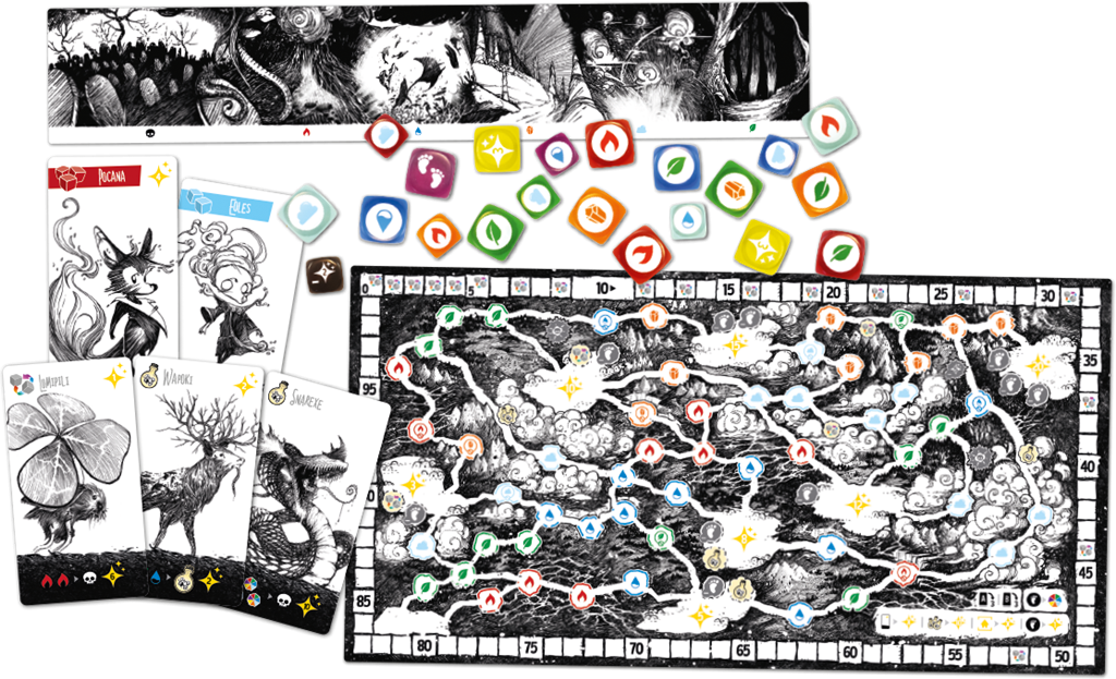 Lueurs se déroule au fil des huit journées qui composent la partie, enrôlez huit compagnons pour constituer peu à peu votre compagnie. Leurs effets, liés aux éléments et activés selon le résultat de vos dés, vous apporteront la majorité des éclats de lumière. Avancez ensuite à la recherche de villages éclairés. Celui qui récoltera le plus d’éclats de lumière dissipera les ténèbres et inscrira son nom dans les textes anciens.